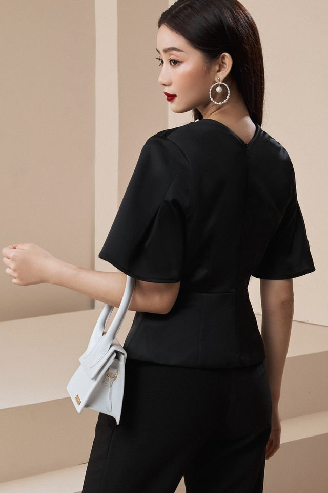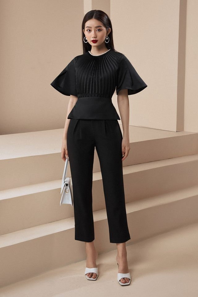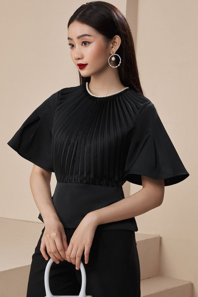 This black pleated ruffled top boasts sleek lines, exuding refined elegance and creating a haute couture-like silhouette. Delicate vertical pleats extend from the neckline, adding rich layers to the garment. The waistline is softly defined, while the hem cascades naturally, forming a clean and crisp ruffle. The oversized short sleeves balance the fitted waist, making this top ideal for creating a sophisticated professional look, attending an evening event, or special occasion.